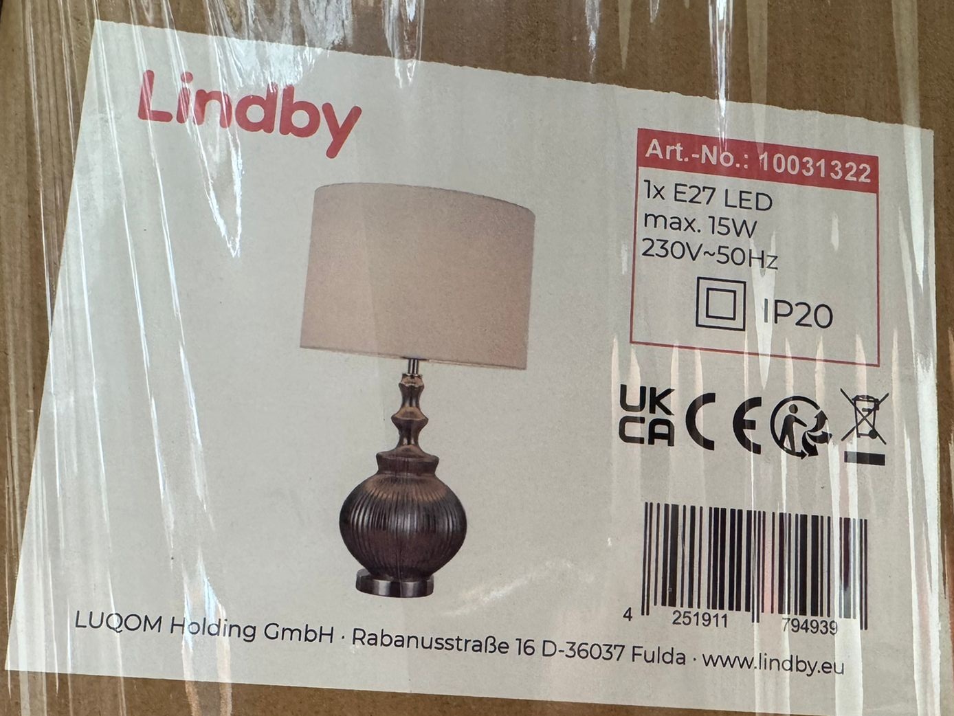 Lampă de masă elegantă Lindby, cu bază metalică decorativă și abajur textil care oferă o lumină caldă și plăcută. Designul clasic se potrivește perfect în dormitor, living sau pe noptieră. Lampa utilizează un bec cu dulie E27 și este ideală pentru iluminat ambiental sau pentru citit.